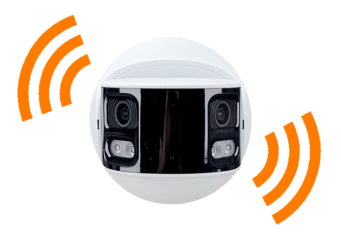 Le telecamere panoramiche a doppio obiettivo supportano anche l'audio vivavoce che puoi usare parlando con il tuo smartphone. Premendo il tasto intercom della nostra app puoi parlare attraverso l'altoparlante della telecamera intervenendo in modo attivo in qualsiasi situazione e senza correre rischi. Puoi anche usare la funzione intercom per fornire istruzioni a personale che si trova di fronte alla telecamera.