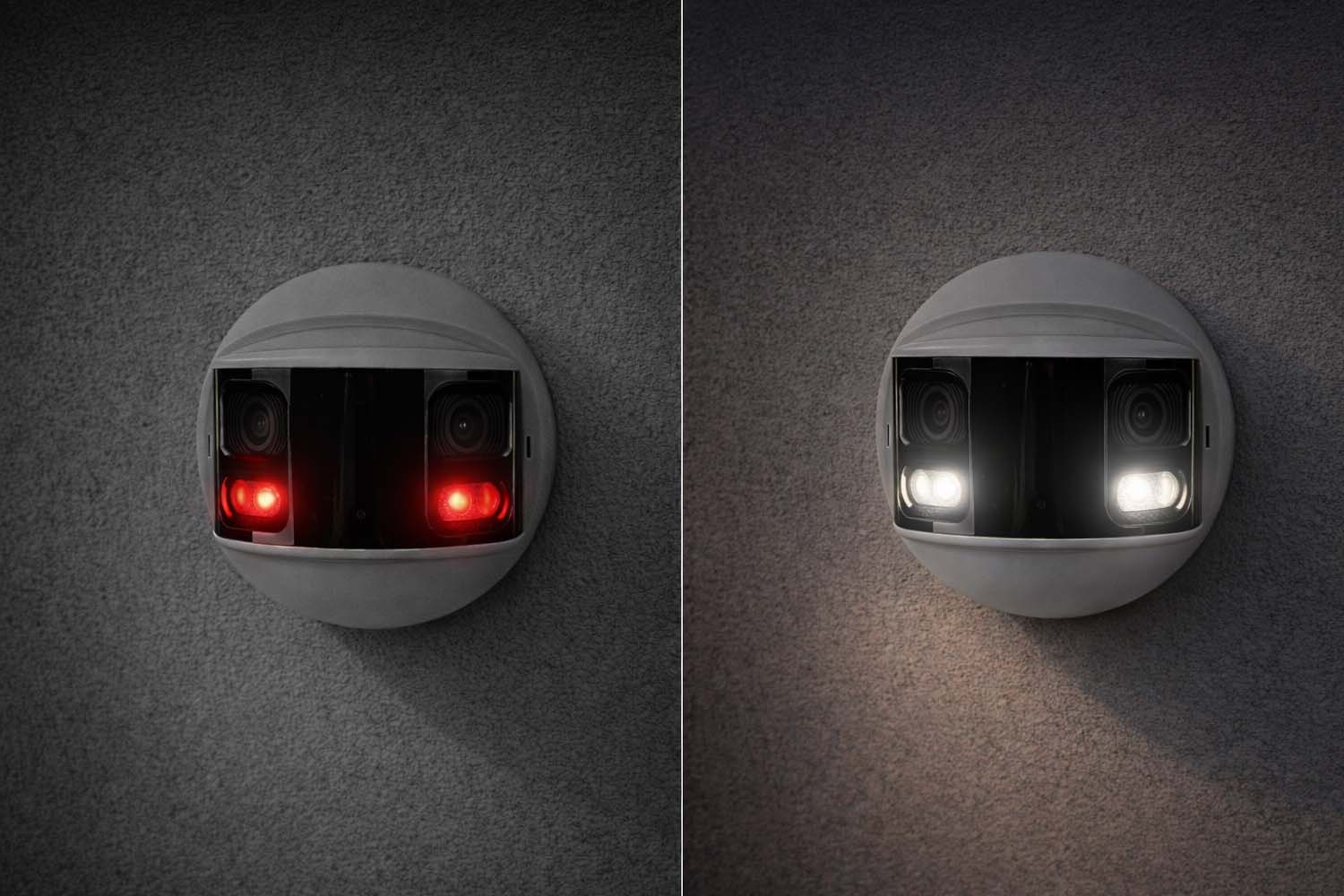 Per monitorare oltre 180 gradi, sia di giorno che di notte, queste telecamere non dispongono solo di un doppio obiettivo, ma anche di un doppio illuminatore notturno, con una portara di illuminazione di 50 metri. L'illuminatore è in grado di produrre sia illuminazione infrarossa che luce bianca visibile. E' possibile scegliere una delle due modalità, ma più frequentemente si imposta la telecamera in modo che illumini normalmente all'infrarosso ed accenda i LED bianchi in caso di intrusione. In questo modo l'area sorvegliata sarà normalmente buia, con ripresa in bianco/nero, e si illuminerà a giorno in caso di rilevazione, passando alla ripresa a colori. L'accensione improvvisa dei LED bianchi ha anche una funzione deterrente e induce l'intruso a desistere.